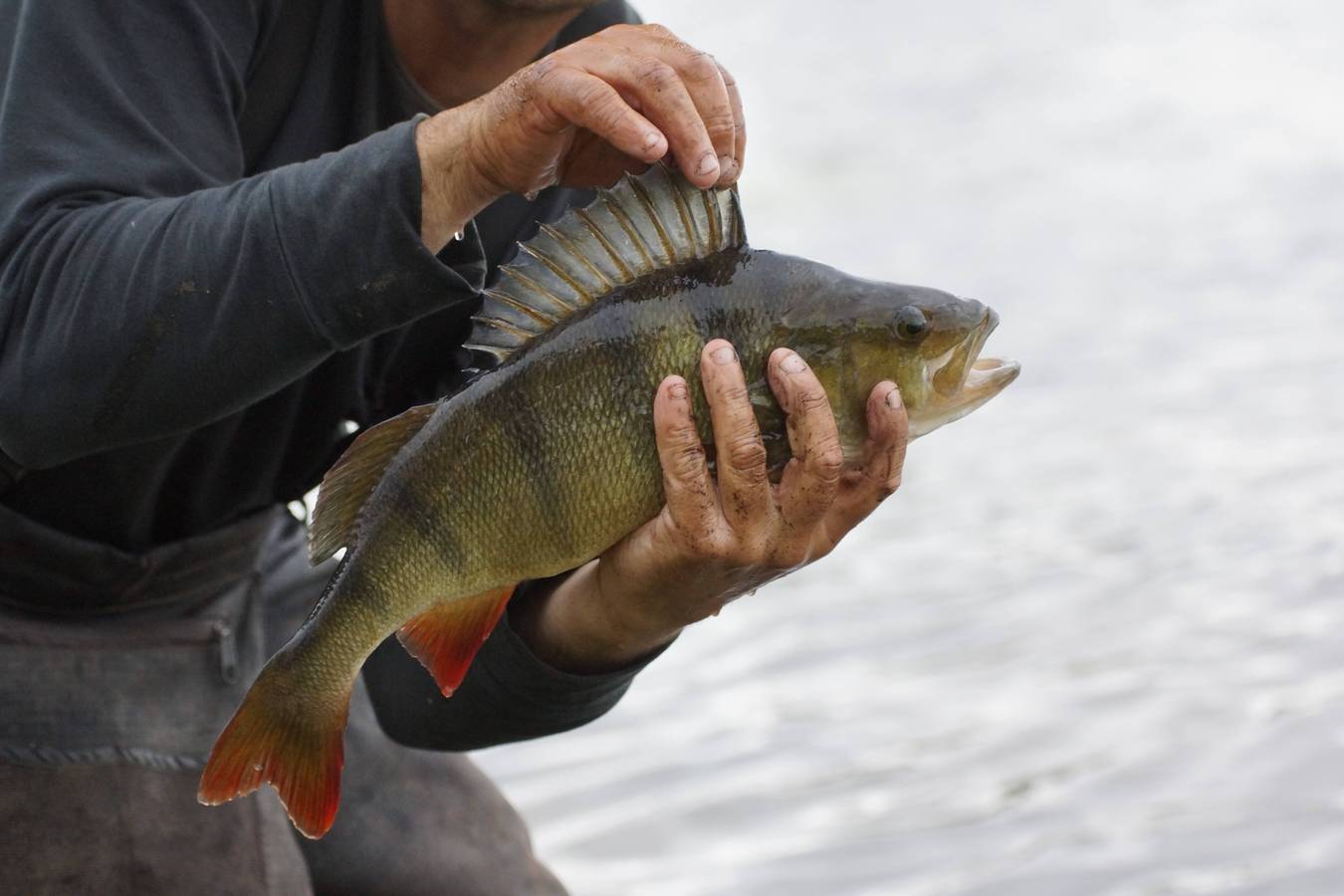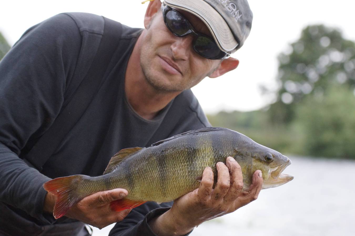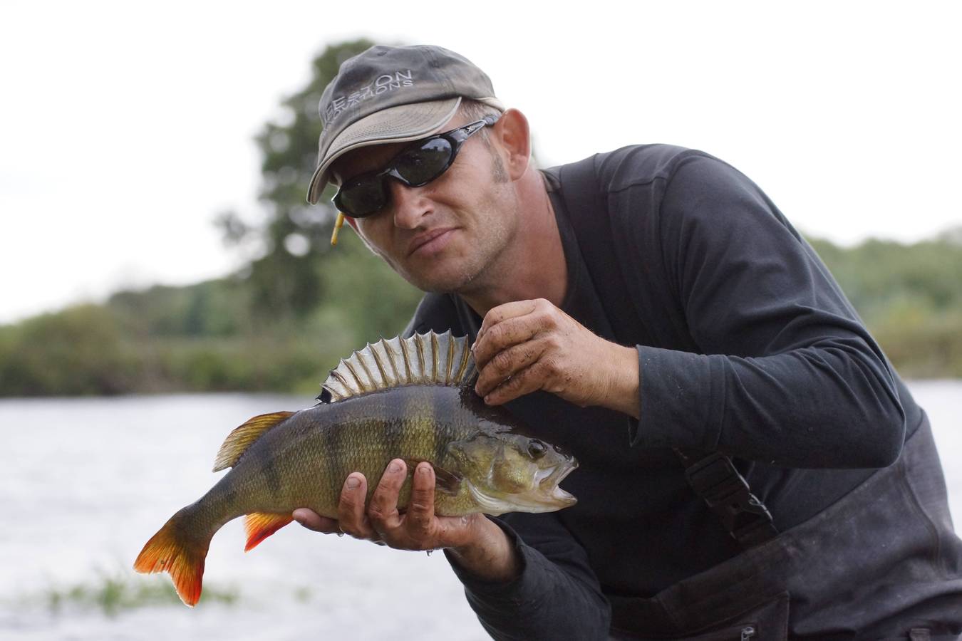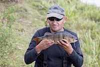 Keith catches a beautiful striped perch for partner Jo. Good news as he'd struggled in the windy conditions to see the bites.
